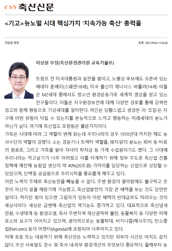 [기고] 뉴노멀 시대 핵심가치 ‘지속가능 축산’ 총력을(이상원 부장)