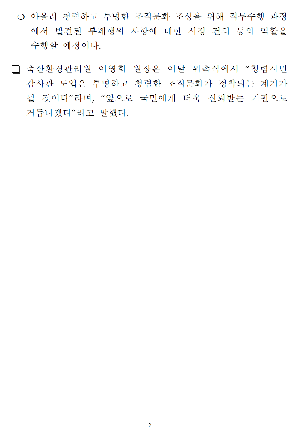 축산환경관리원 이영희 원장은 이날 위촉식에서 “청렴시민감사관 도입은 투명하고 청렴한 조직문화가 정착되는 계기가 될 것이다”라며, “앞으로 국민에게 더욱 신뢰받는 기관으로 거듭나겠다”라고 말했다.-