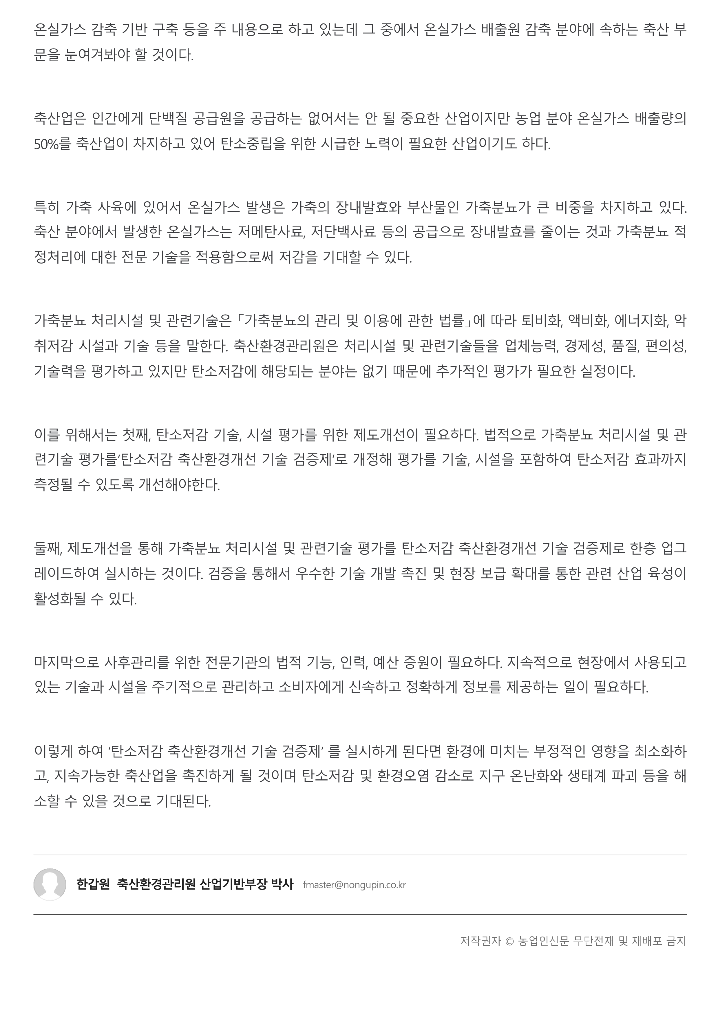 [기고문] 탄소저감 가축분뇨 처리시설과 관련기술 검증제도(산업기반부 한갑원 부장)