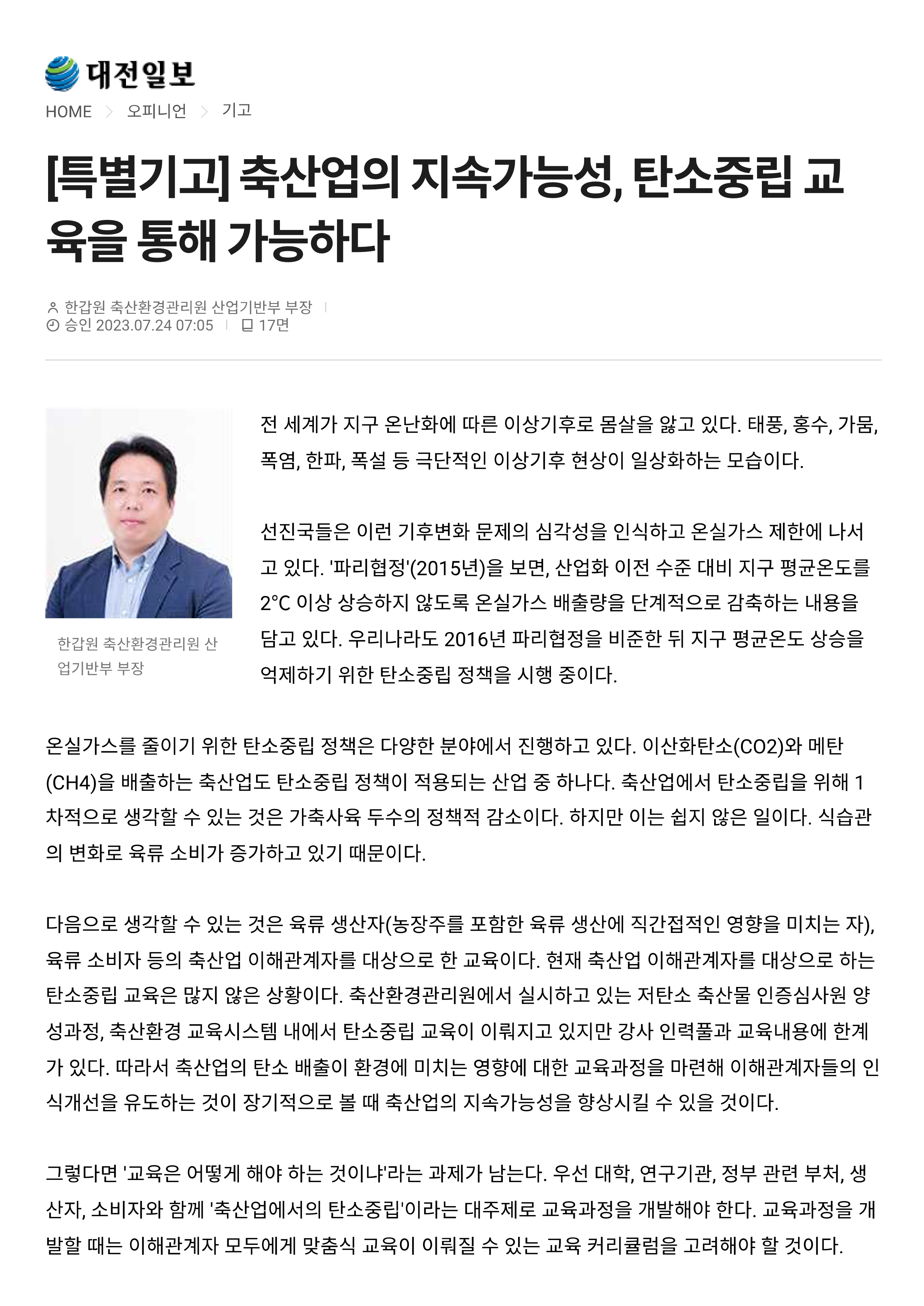 230724 [기고문] 축산업의 지속가능성, 탄소중립 교육을 통해 가능하다(산업기반부 한갑원 부장).pdf